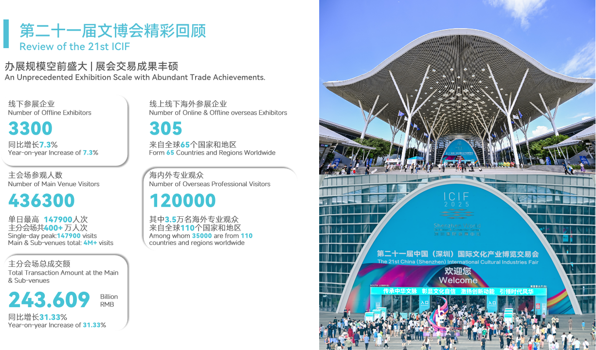 中共中央宣傳部、中華人民共和國文化和旅游部、國家廣播電視總局共同主辦深圳市人民政府承辦的文博會,歷經二十余載發展,已成為中國規模最大、影響力最廣的文化產業盛會。