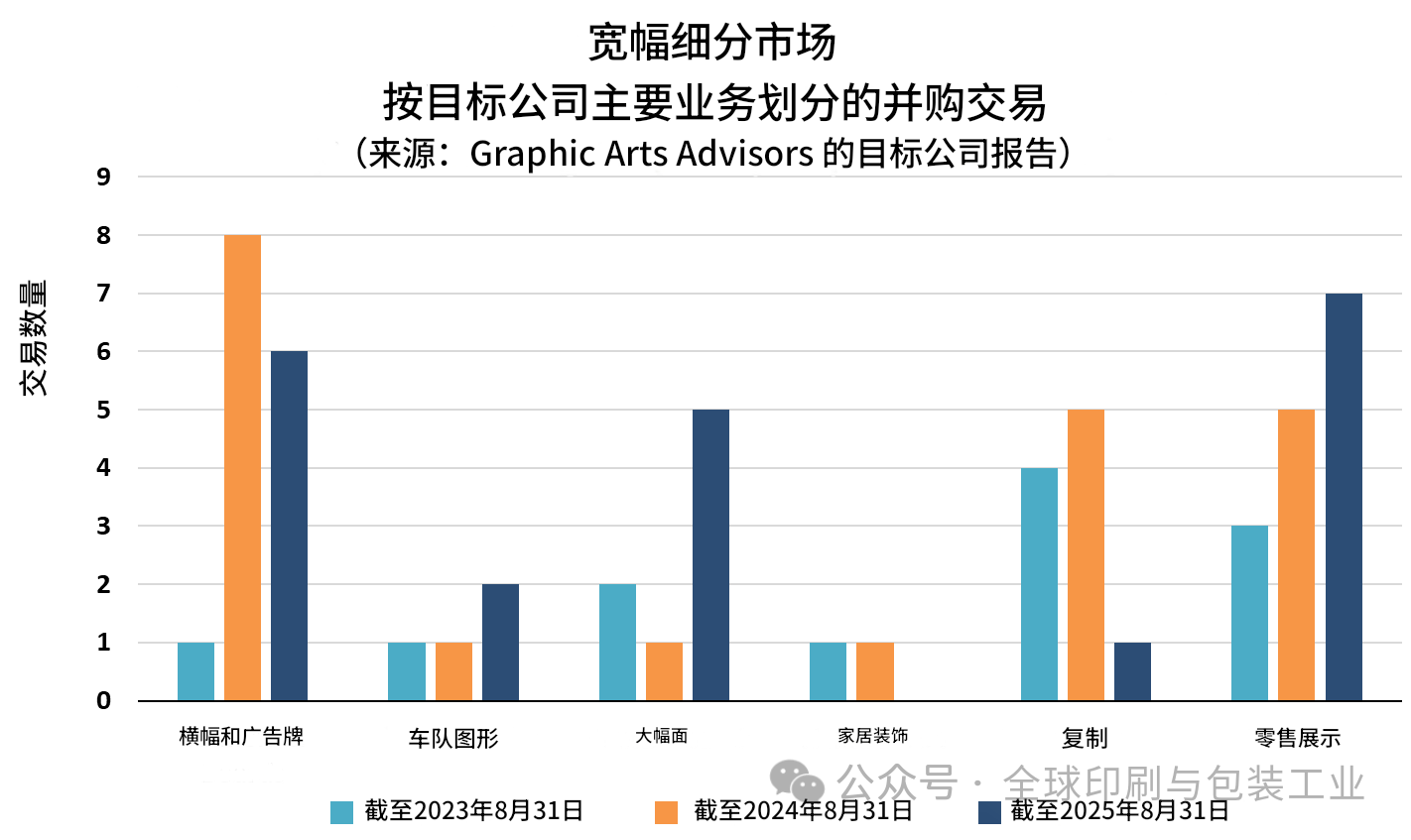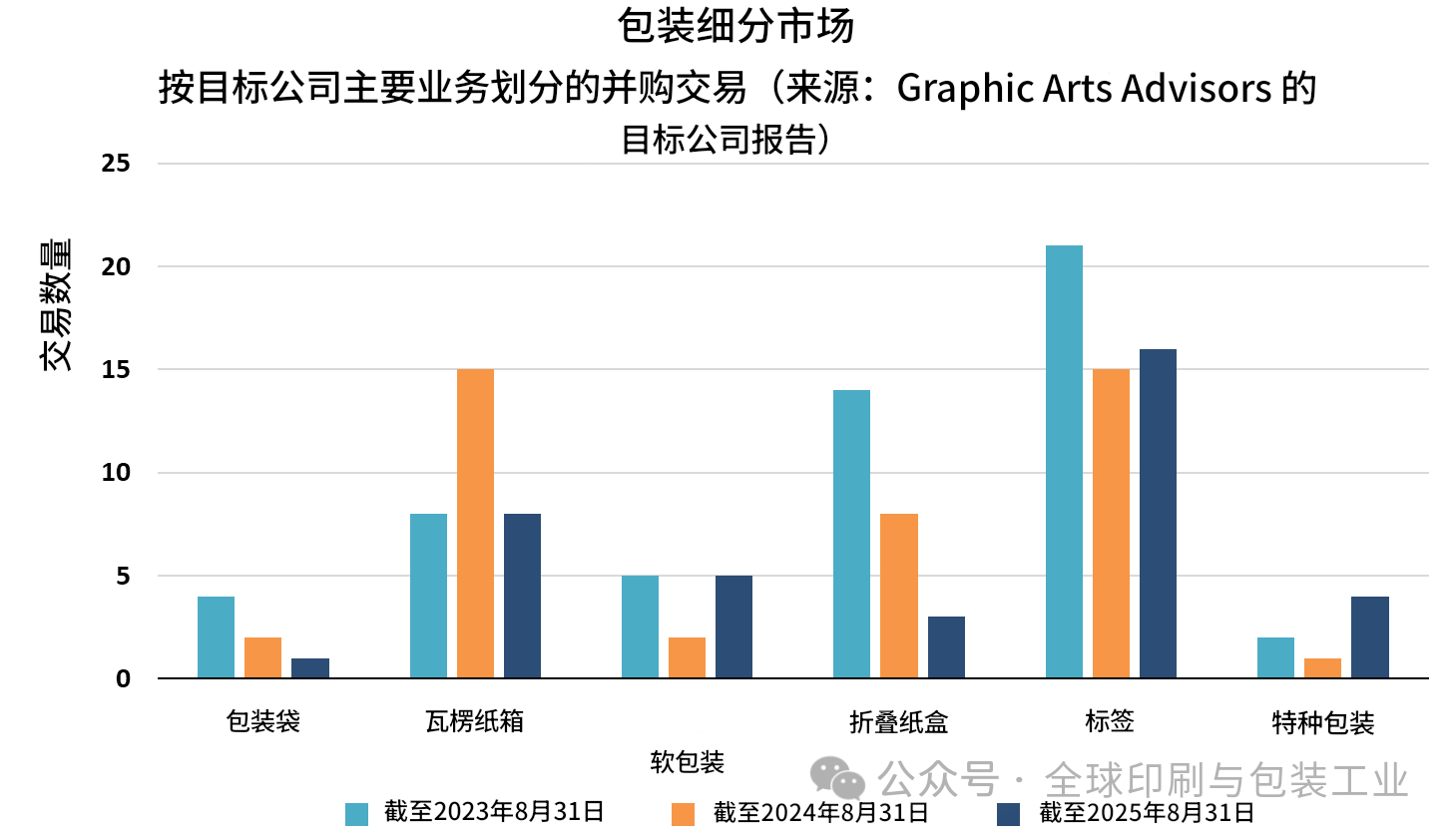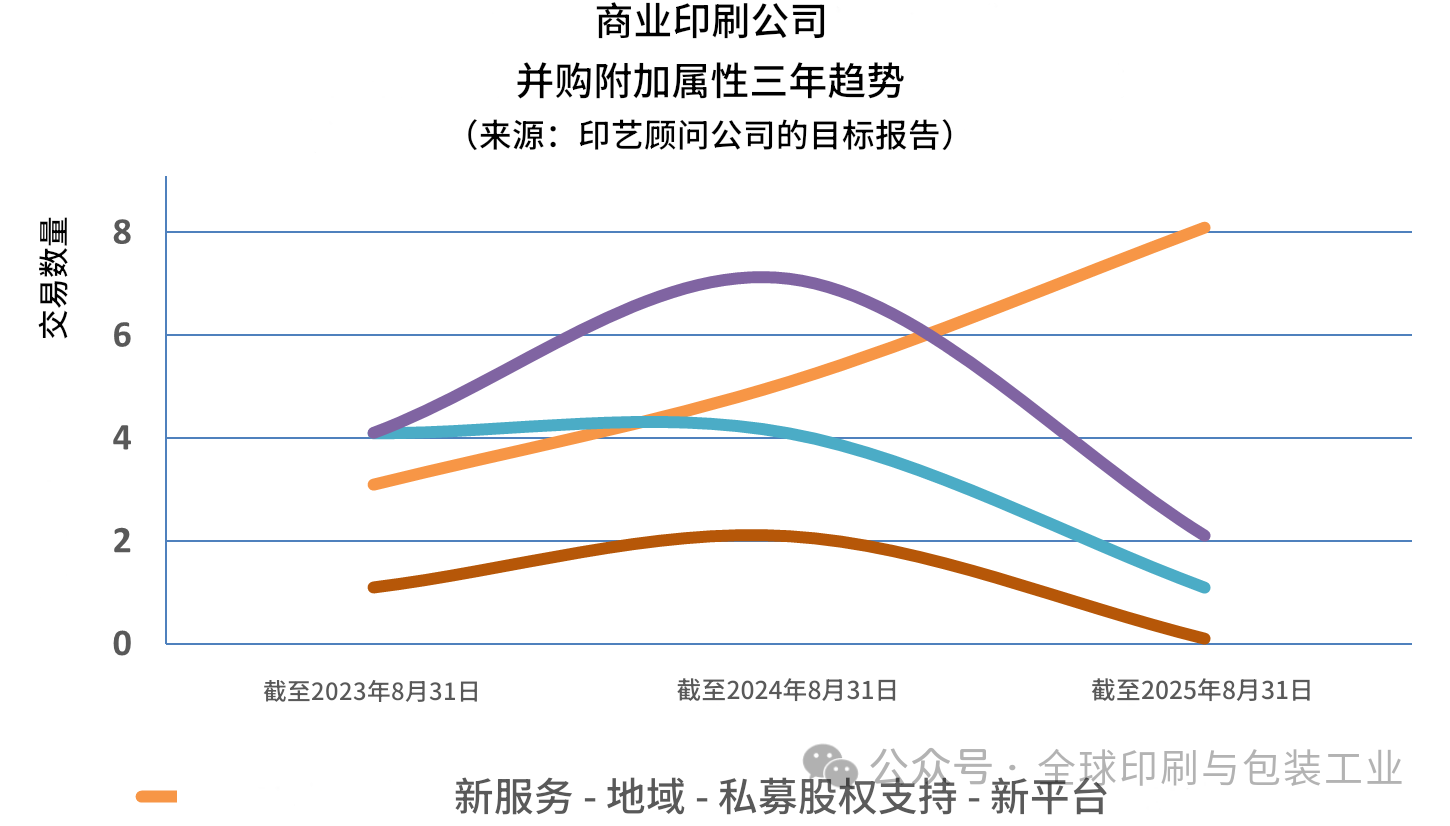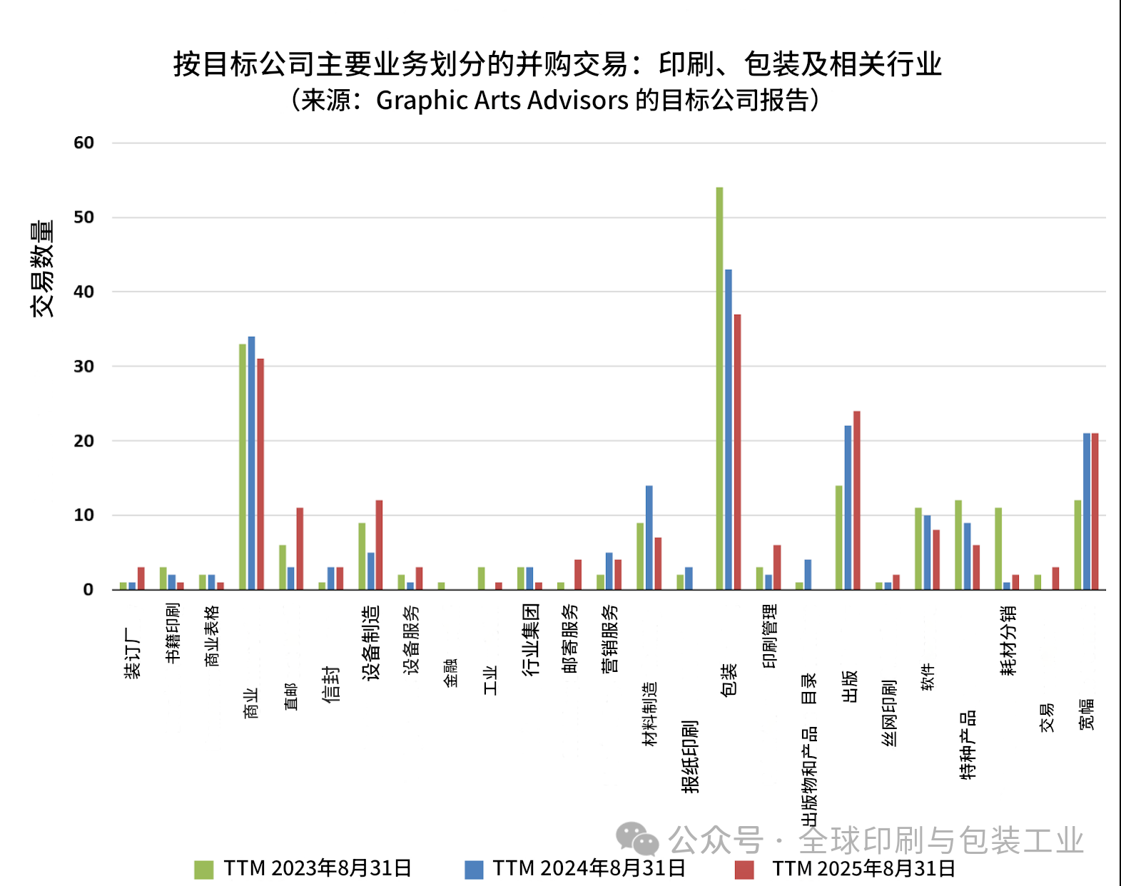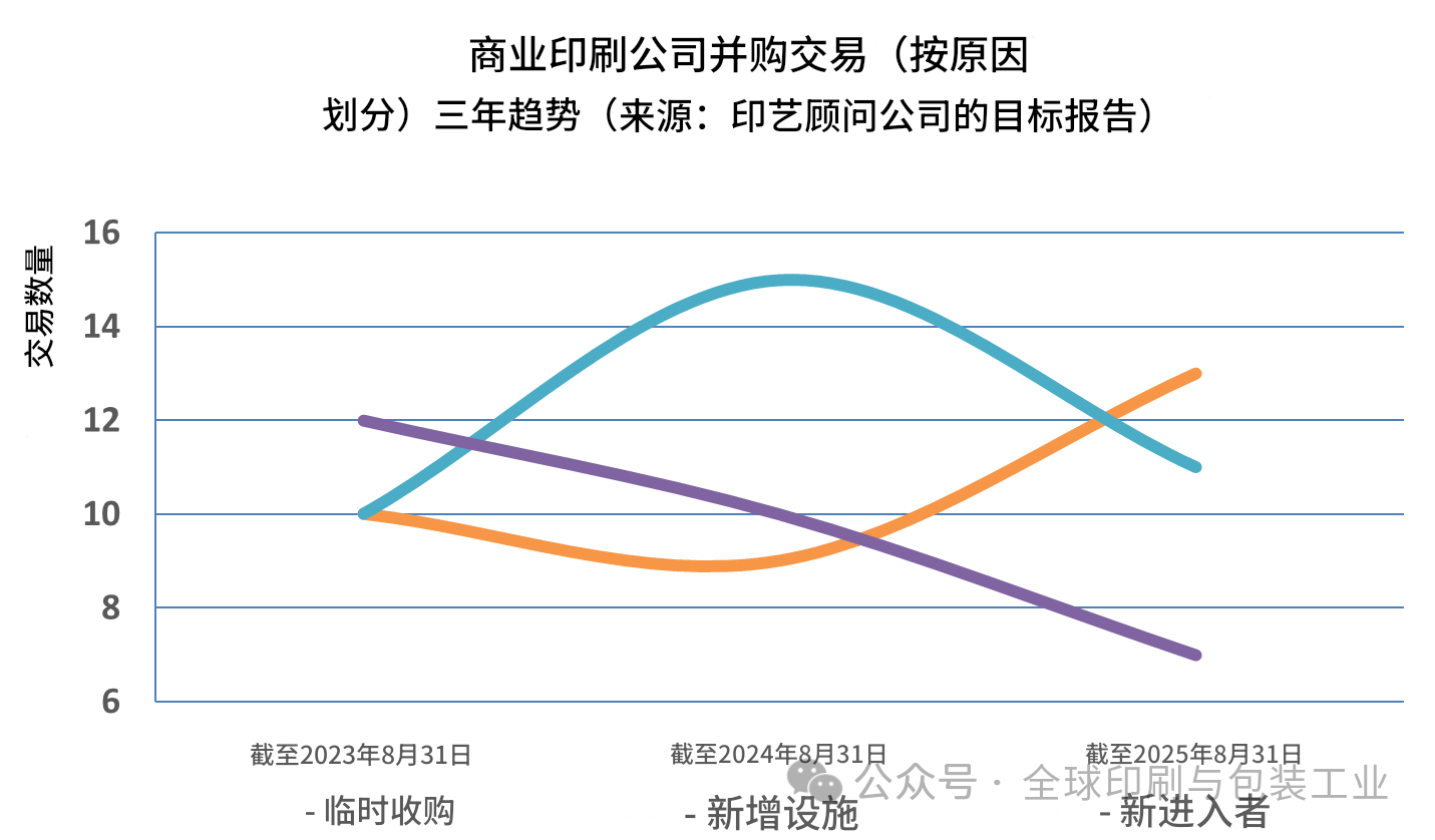 十四年來,GAA(印藝顧問公司)持續(xù)記錄與評論以包裝印刷行業(yè)為中心的多條業(yè)務線的并購活動,重點覆蓋商業(yè)印刷、包裝(標簽、折疊紙盒、軟包裝)、大幅面印刷市場等。在每年8月,都會回看過去12個月的交易特征,以判斷行業(yè)的未來走向:哪些細分的并購增多或減少?買方完成收購的主導邏輯如何變化?是擴張網絡還是并入整合?對未來各細分的潛在交易活動有何啟示?