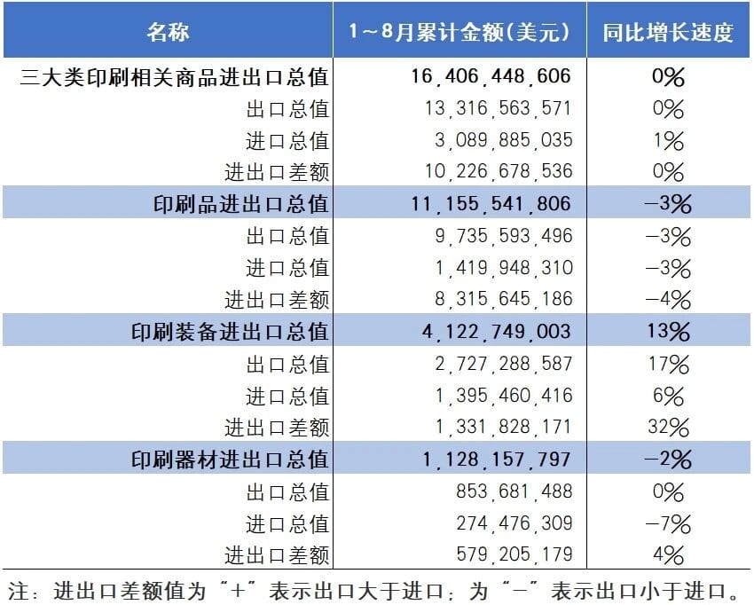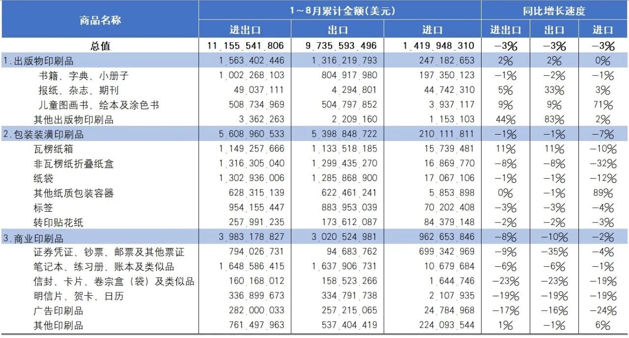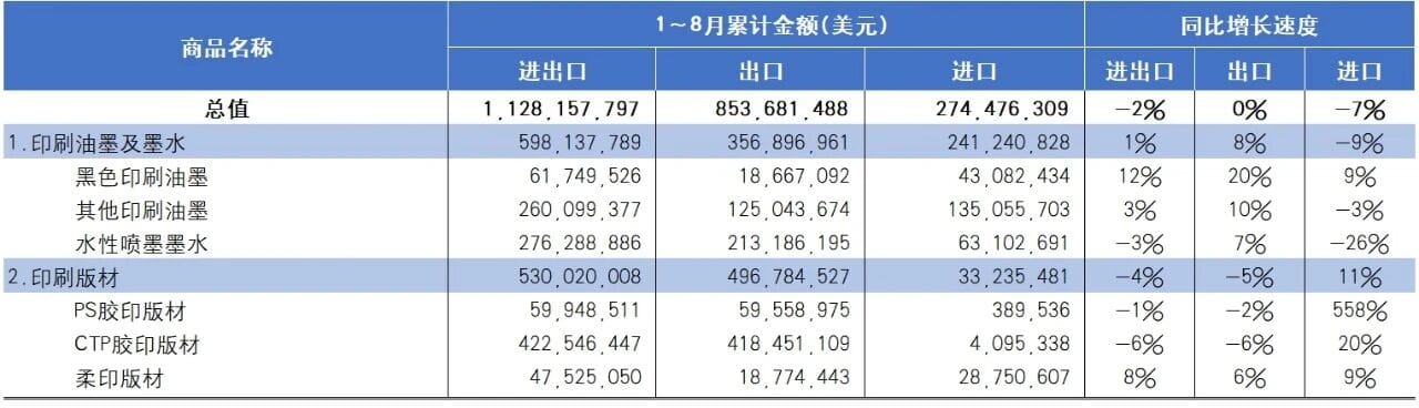 2025年1~8月國內(nèi)三大類印刷相關(guān)商品進(jìn)出口總體運(yùn)行概況如下: