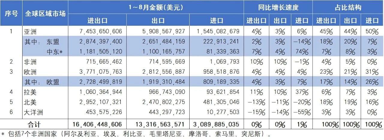 04/ 從進(jìn)出口市場(chǎng)分布動(dòng)態(tài)看,出口商品,對(duì)亞洲、歐洲、拉美、非洲市場(chǎng)出口保持增長,對(duì)北美、大洋洲市場(chǎng)出口持續(xù)下滑;進(jìn)口商品,從亞洲、歐洲、拉美進(jìn)口保持增長,從北美、大洋洲、非洲市場(chǎng)進(jìn)口維持下降