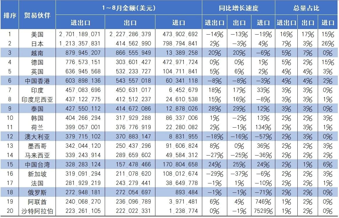 2025年1~8月居中國三大類印刷相關(guān)商品進(jìn)出口額前20位的貿(mào)易伙伴有,美國、日本、越南、德國、英國、中國香港、印度、印度尼西亞、韓國、泰國等(參見表6),其進(jìn)出口金額合計(jì)116.64億美元,占中國三大類印刷相關(guān)商品進(jìn)出口總值的71%。