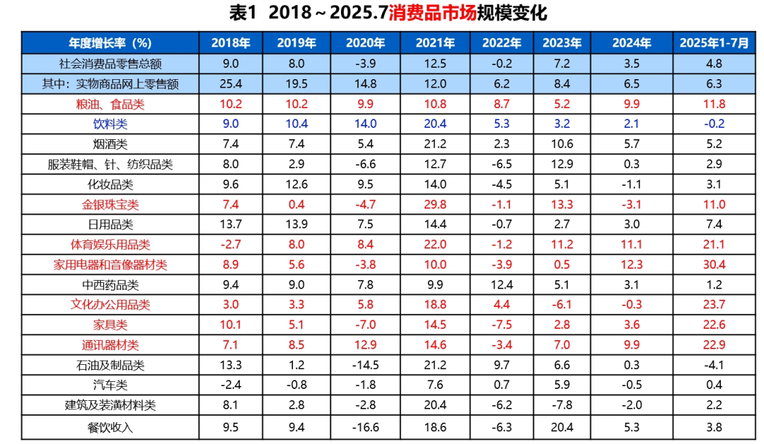 最后,請大家看一下消費市場的數據。研究這組數據,因為這里很多是印刷企業的客戶行業,大家也可以從這組數據中感知經濟的脈動。從總量上看,截至7月,全社會消費品零售總額的增速為4.8%,去年全年是3.5%,如此看來,消費數據是有所回升的(見表1)。回升集中在哪些品類?大家請看紅色行,這些品類都實現了兩位數的增長。具體來說,基于消費品以舊換新政策的支持,“家用電器和音像器材類”增速超過30%,“文化辦公用品類”“家具類”“通訊器材類”的增速也均超過了20%。而升級類消費,像“體育娛樂用品類”“金銀珠寶類”增長也比較快。相比之下,“煙酒類”增速為5.2%,“化妝品類”增速為3.1%,“中西藥品類”增速為1.2%,而“飲料類”增速為-0.2%,我們的很多包裝印刷企業正是這些品類的服務商。